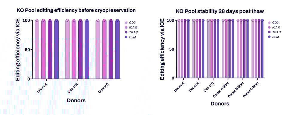 Figure 1. High editing efficiency across multiple donors. Three different donors (A, B and C) show high editing efficiency (>90%), as determined by ICE analysis, across various targeted loci with little change between deliverable (before cryopreservation, left graph) and extended culture (28 days post-thaw, right graph). Cell stimulation after thawing did not affect KO levels.