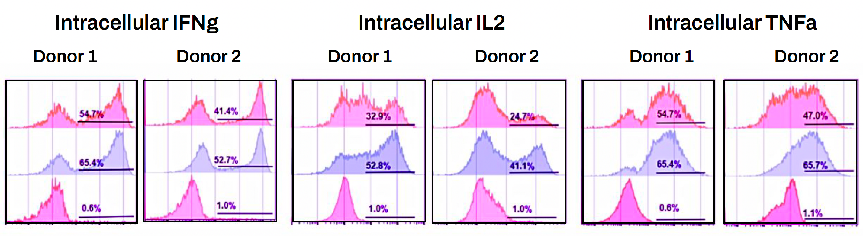 Figure 5. Intracellular Cytokine measurement in edited cell pools. Knockout CD4+ T cell pools of IFNg, IL2 or TNFa were thawed and stimulated with PMA/ionomycin for 6 hours. Cells were stained for CD3, CD4 and viability, permeabilized and then stained for presence of IFNG, IL2 or TNFA. Production of either cytokine in CD3/CD4/Live gated events for each Gene Target knockout culture (Bottom histograms) was compared to unedited control (Mock, Middle histograms) as well as TRAC knockout (Top histograms).